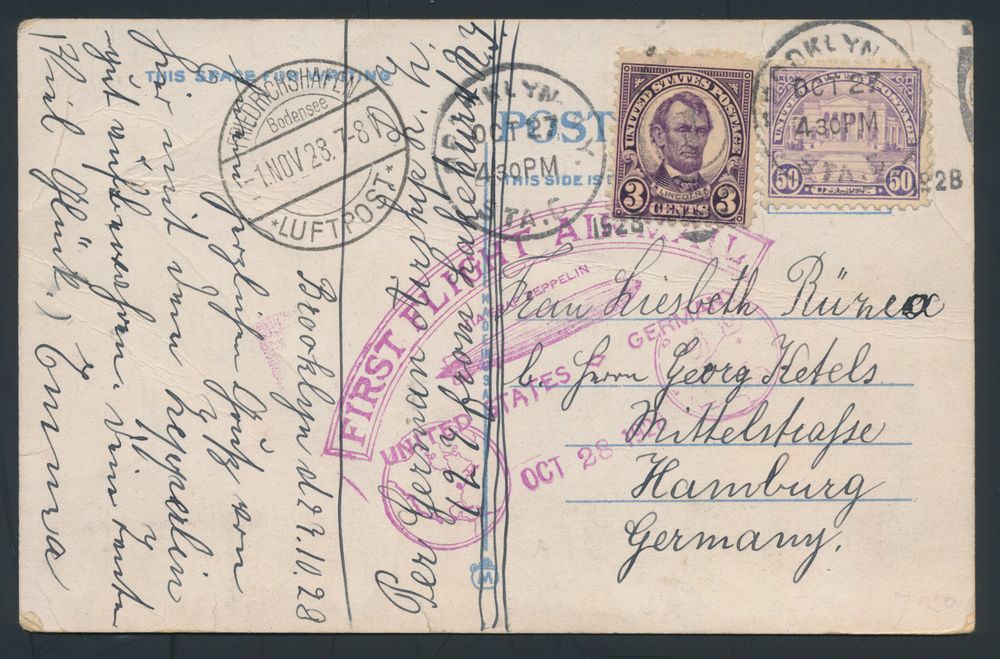 4375 image27.10.1928 N° 8Ac (Mi. Zeppelin Specialised), LZ 127 Amerikafahrt illustrated postcard sent from Brooklyn, NY to Hamburg, Germany and franked for 53c, zeppelin flight cachet "First Flight Air Mail" in violet alongside, as well as Friedrichshafen arrival c.d.s., minor creasing but overall fine, vf(Image 1) (Image 2)