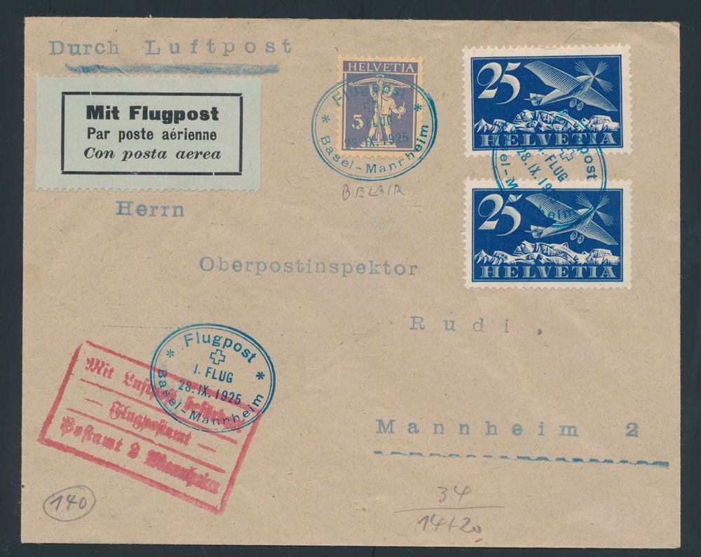 4373 image28.9.1952 N° 25.64/01 (Mi. Zeppelin Specialised), Basel-Mannheim Flight cover showing the oval flight cachet in blue used both on the cover as well as obliterator for the Swiss franking, with Mannheim arrival framed postmark on the front as well, vf(Image 1) (Image 2)