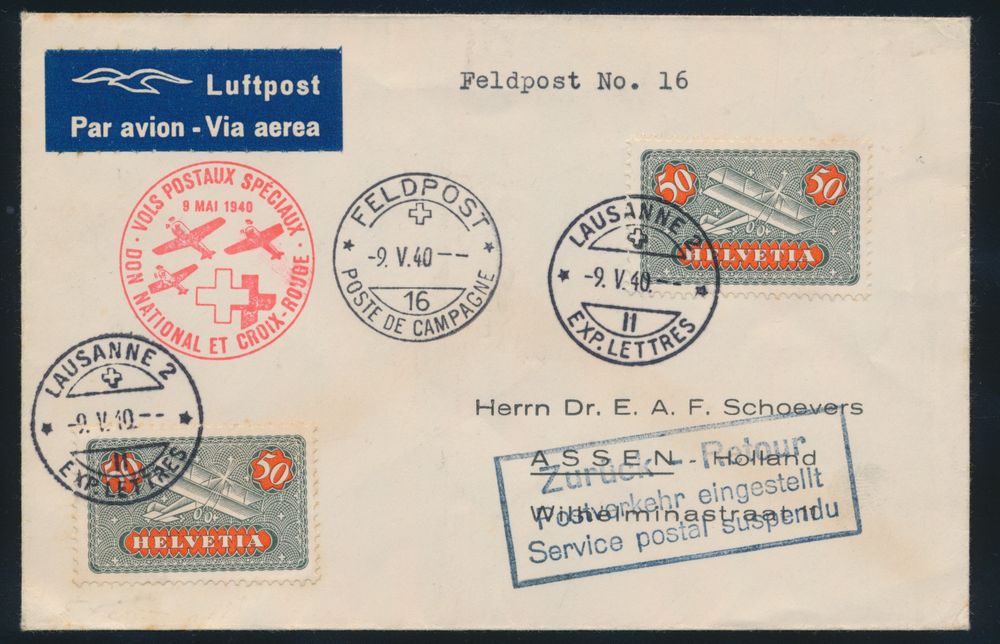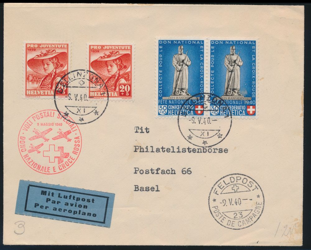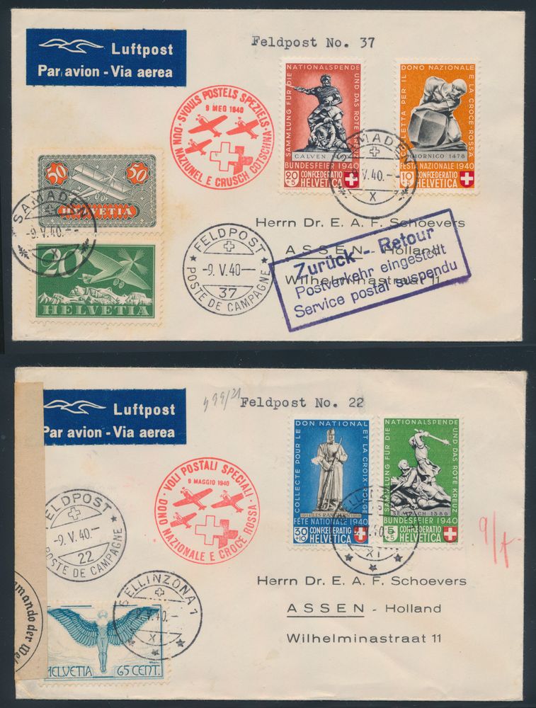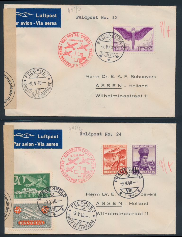 4370 image9.5.1940 Special Postal Flights for the benefit of the Red Cross lot of 3 covers sent from Samedan and Bellinzona respectively to Assen, Netherlands, and Basel, Switzerland respectively, each franked with, amongst others, PRO PATRIA stamps of the 1940 issue, one of the covers to Assen with German censorship, vf/f(Image 1) (Image 2)