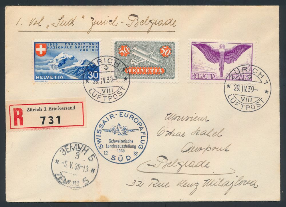 4363 image29.4.1939 SWISSAIR Europa Flight on the occasion of the Swiss National Exhibition of 1939 registered cover sent from Zürich to Belgrade, Serbia and franked for 1fr80rp, stamps cancelled in Zürich, special flight cachet alongside in blue, Serbian Zemun transit c.d.s. on the front, vf(Image 1) (Image 2)