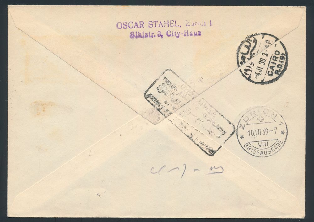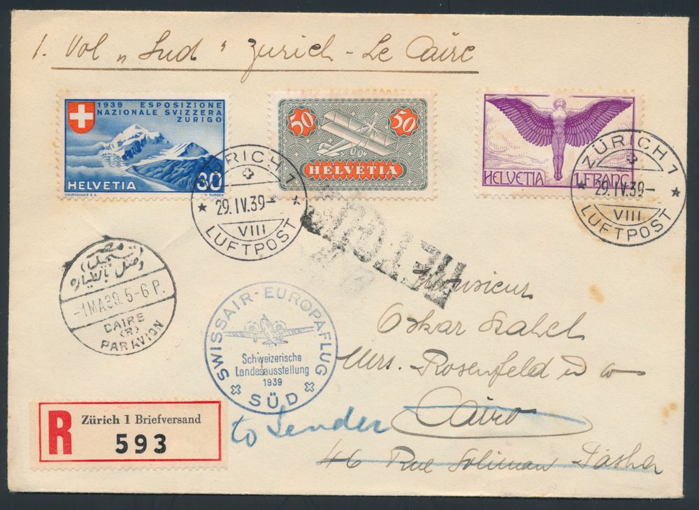 4364 image29.4.1939 SWISSAIR Europa Flight on the occasion of the Swiss National Exhibition of 1939 registered cover sent from Zürich to Cairo, Egypt and franked for 1fr80rp, stamps cancelled in Zürich, special flight cachet alongside in blue, returned to sender, various transit and arrival postmarks on both front and back, including the final Zürich return c.d.s. dated 10.7, uncommon, f(Image 1) (Image 2)