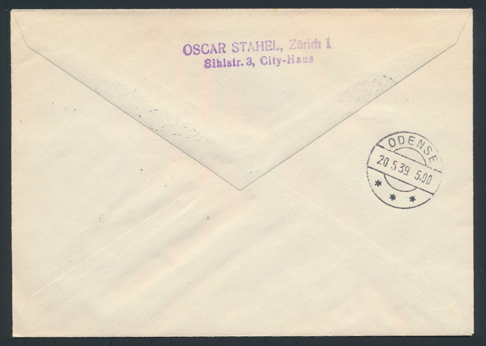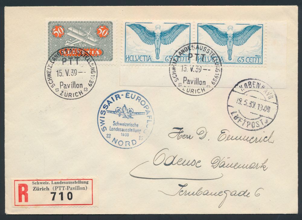 4362 image15.5.1939 SWISSAIR Europa Flight on the occasion of the Swiss National Exhibition of 1939 registered cover sent from Zürich to Odensee, Denmark, franked for 1fr80rp and cancelled with the special postmark of the exhibition, transit c.d.s. on the front and arrival c.d.s. on the back, vf(Image 1) (Image 2)