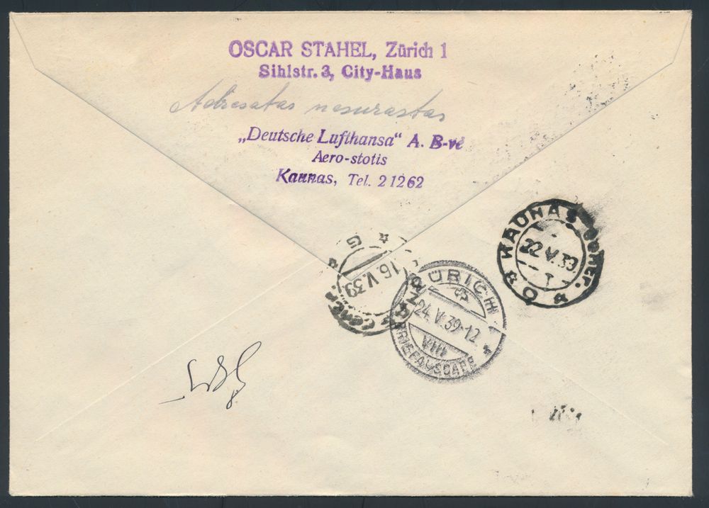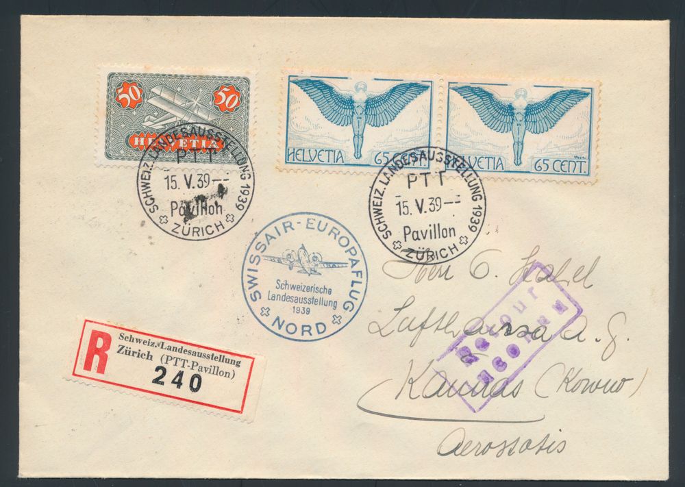 4367 image15.5.1939 SWISSAIR Europa Flight on the occasion of the Swiss National Exhibition of 1939 registered cover sent from Zürich to Kaunas, Lithuania, franked for 1fr80rp and cancelled with special postmark of the exhibition, flight cachet alongside in blue, transit and arrival c.d.s.' on the back, vf(Image 1) (Image 2)