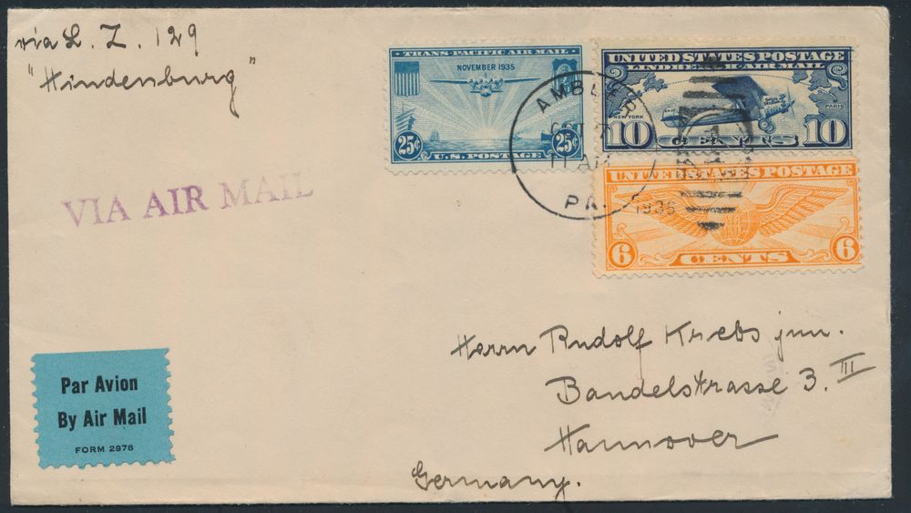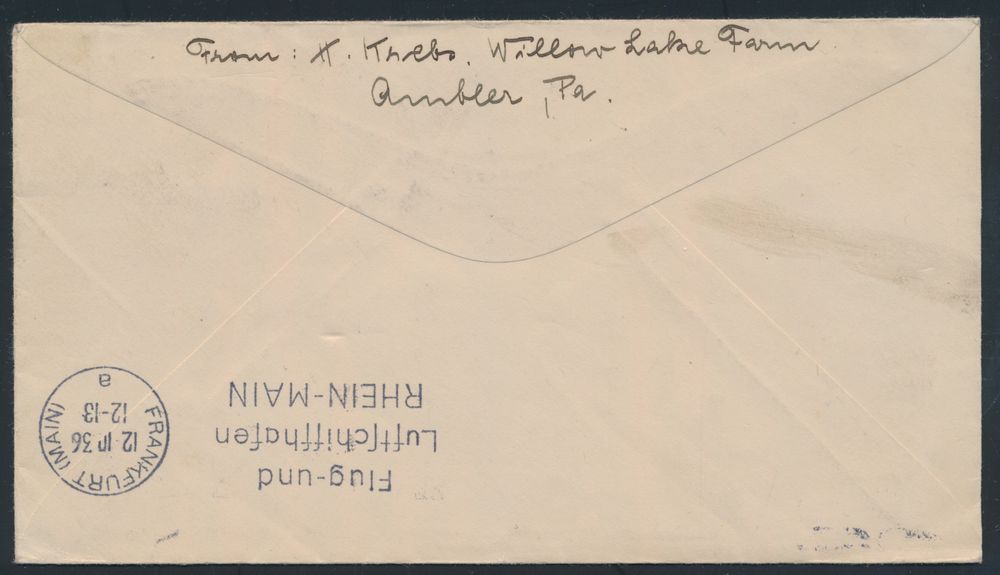 4380 image7.10.1936 N° 47A (Mi. Zeppelin Specialised), LZ 129 Nordamerikafahrt cover sent from Ambler, PA to Hannover, Germany, bearing airmail franking and no zeppelin flight cachet, Friedrichshafen arrival postmark on the back, vf(Image 1) (Image 2)