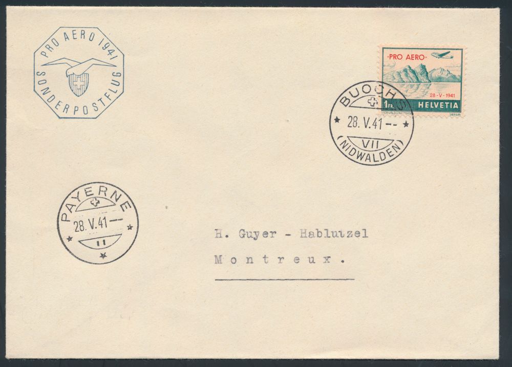 4372 image28.5.1941 Pro Aero Flight cover addressed to Montreux and flown between Buochs and Payerne, franked with the overprinted stamp issued for this flight (SBK F35), flight cachet at upper left, vf(Image 1) (Image 2)