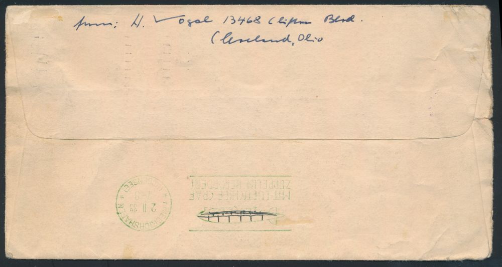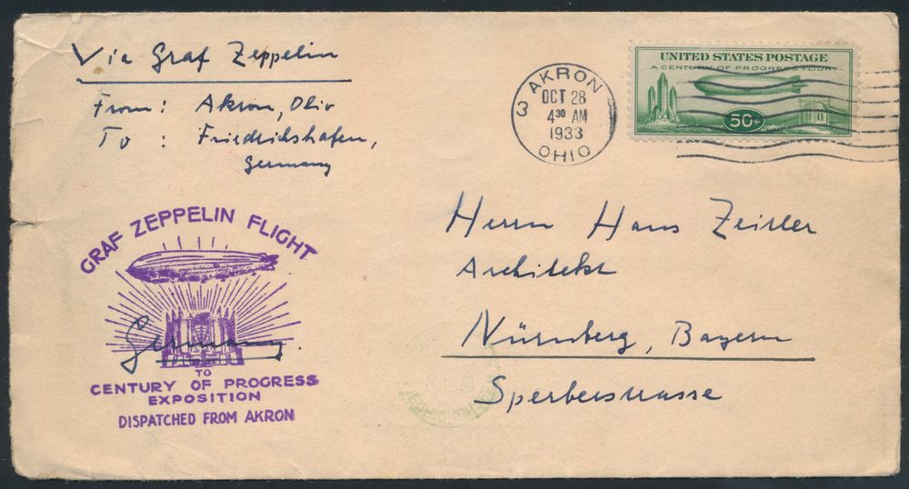 4379 image28.10.1933 N° 355Cc (Mi. Zeppelin Specialised), LZ 127 Century of Progress Chicago Exhibition Flight cover sent from Akron, Ohio to Nürnberg, Germany and franked with 50c zeppelin stamp (Michel 358, cat. value €100 on cover) tied by normal machine postmark, zeppelin flight cachet alongside on the front in violet and Friedrichshafen arrival postmark on the back in green, vf(Image 1) (Image 2)