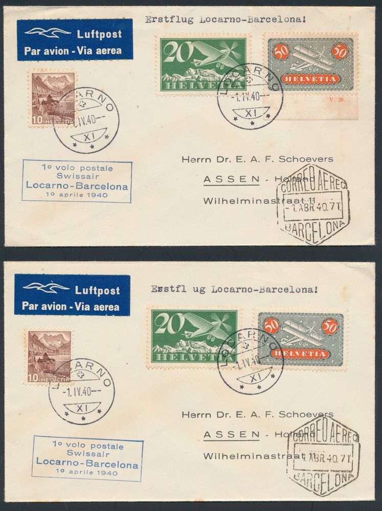 4371 image1.4.1940 SWISSAIR Locarno-Barcelona First Mail Flight 2 covers both sent to Assen, Netherlands and both franked for 70rp, hexagonal Barcelona landing c.d.s. on the front, some foxing here and there but still a useful lot, vf/f(Image 1) (Image 2)