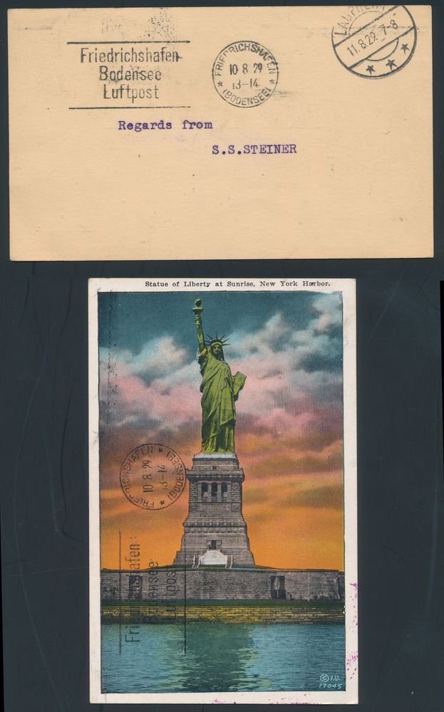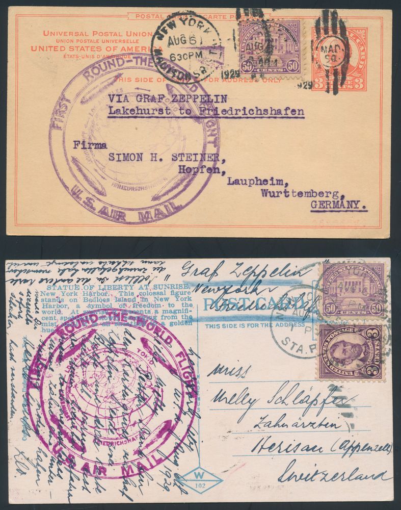 4377 image6.8.1929 N° 28Aa (Mi. Zeppelin Specialised), LZ 127 Amerikafahrt two postcards both sent from New York to Switzerland and Germany respectively, both franked for 53c and both showing the zeppelin flight cachet "First Round-the-World Flight U.S. Air Mail" in violet, Friedrichshafen arrival postmarks on back, vf(Image 1) (Image 2)