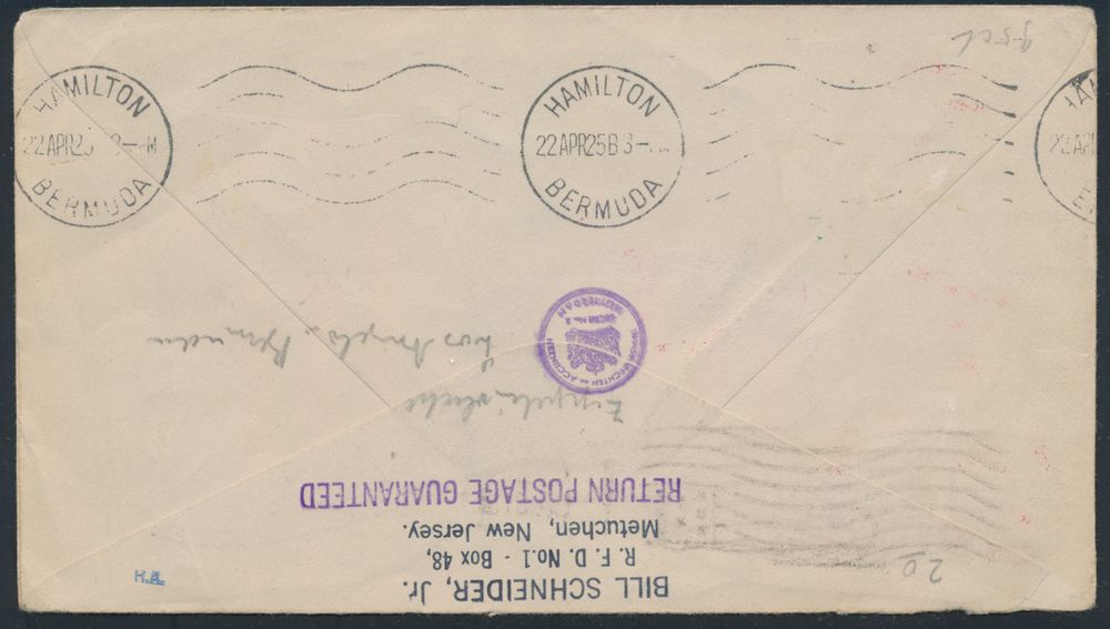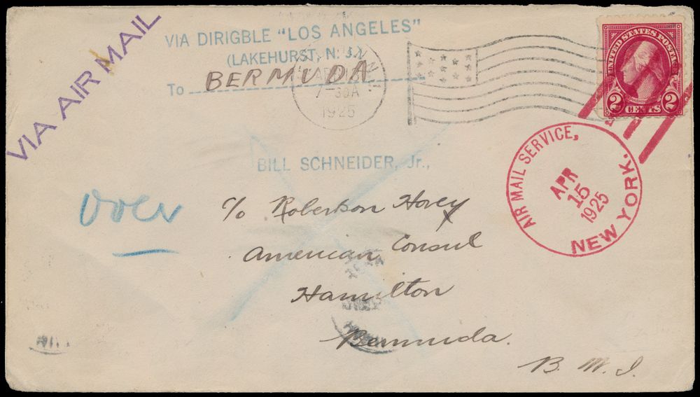 4374 image15.4.1925 N° 5b (Mi. Zeppelin Specialised), ZR 3 "Los Angeles" (an airship produced by the Zeppelin Works in Germany under the number LZ 126 and taken over by the United States and subsequently renamed and operated by the US Navy) cover sent from Metuchen, NJ to Hamilton, Bermuda, franked with a 2c stamp cancelled by a New York airmail postmark in red on departure, arrival c.d.s. on the back, uncommon, vf(Image 1) (Image 2)