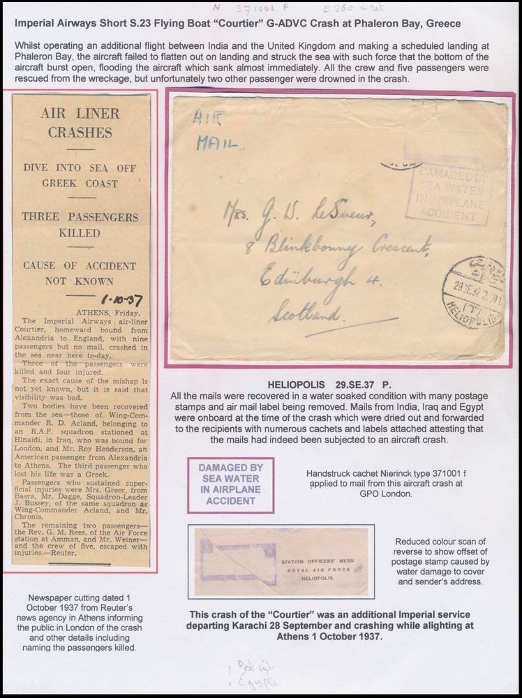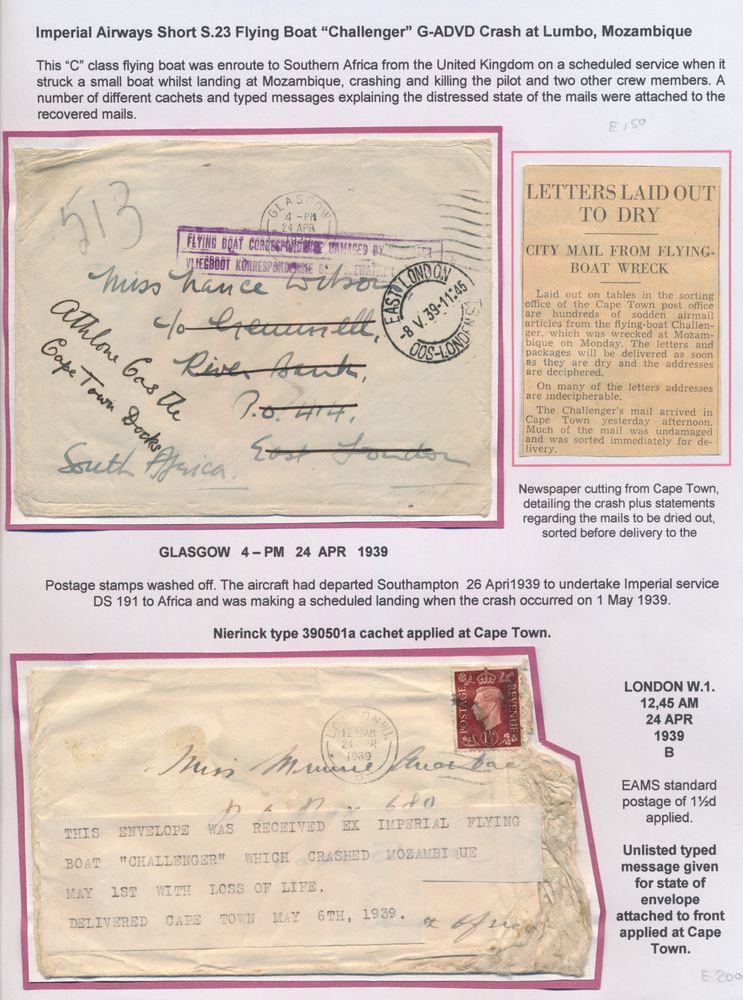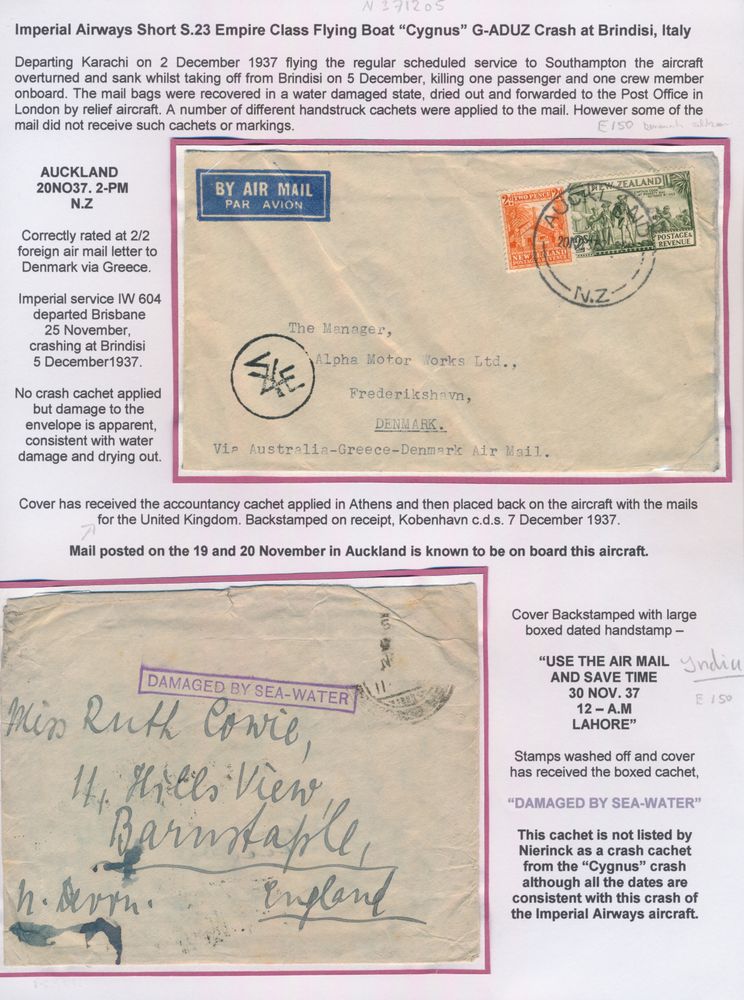 4385 imageBritish Empire 1930s Imperial Airways crash mail fascinating collection profusely written up on exhibition pages, consisting of 10 covers each with extensive context and explanations provided, the nature of the covers themselves is usually rather exotic and certainly uncommon, given that Imperial Airways operated almost exclusively on the "far flung" routes of the British Empire, predominantly in Australia, New Zealand, Oceania, South Africa, Middle and Far East, etc., overall a great collection and an equally great basis for expansion, vf/f(Image 1) (Image 2) (Image 3)