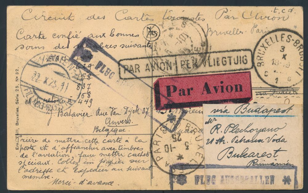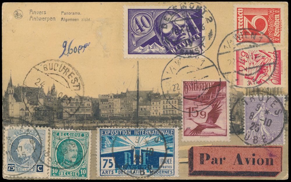 4384 imageBelgium, 1925 "round-the-world" postcard originating in Belgium (Antwerp, 3.10.1925) and sent via airmail to France, Swizerland, Austria and, eventually, to Bucharest, Romania where it arrived on 24.10.1925, on the front it bears stamps from all of the countries it passed through except Romania and on the back it bears numerous airmail postal markings including two strikes of a framed "FLUG AUSGEFALLEN" ("flight cancelled") from either Swittzerland or Austria, all in all very good condition for an item of this nature and scarce because of two reasons: the fact that its journey ended in Romania (not common for round-the-world cards) and the fact that it travelled by airmail, vf(Image 1) (Image 2)