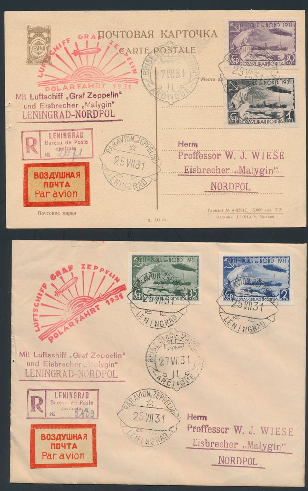 4392 image1931/25/07 Polarfahrt Leningrad- Nordpol, picture postcard with illustrations of postage stamps and letter (with imperforate), stamps from Russia with polar bear and Zeppelin, vf.(Image 1)