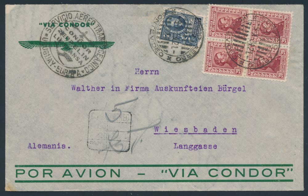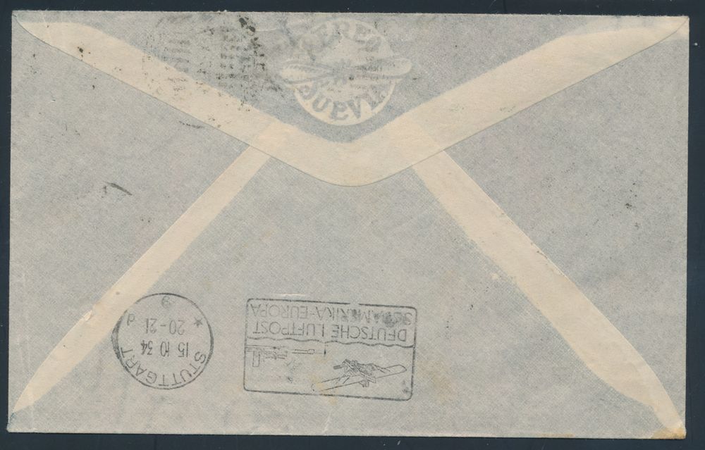 4393 imageUruguay : 9.10.1934 N° 409D (Mi. Zeppelin Specialised), LZ 127 South America Flight cover from Montevideo, Uruguay to Wiesbaden, Germany, regular but nice Uruguayan franking as well as zeppelin flight cachet on the front, Stuttgart transit slogan postmark on the back, vf(Image 1) (Image 2)
