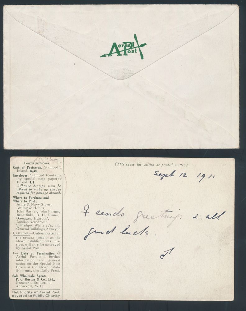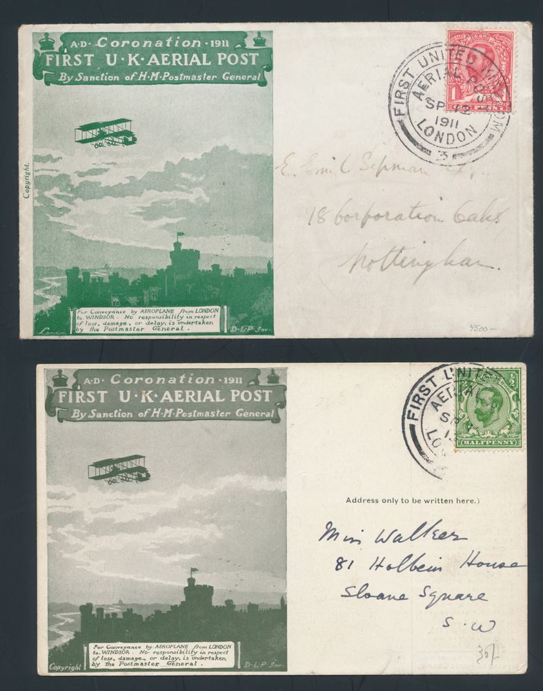 4388 imageGreat Britain 12.9.1911 First U.K. Aerial Post dark olive green postcard franked with 1/2d and addressed to London and green envelope franked with 1d and sent to Nottingham, both with special postmark, vf(Image 1) (Image 2)