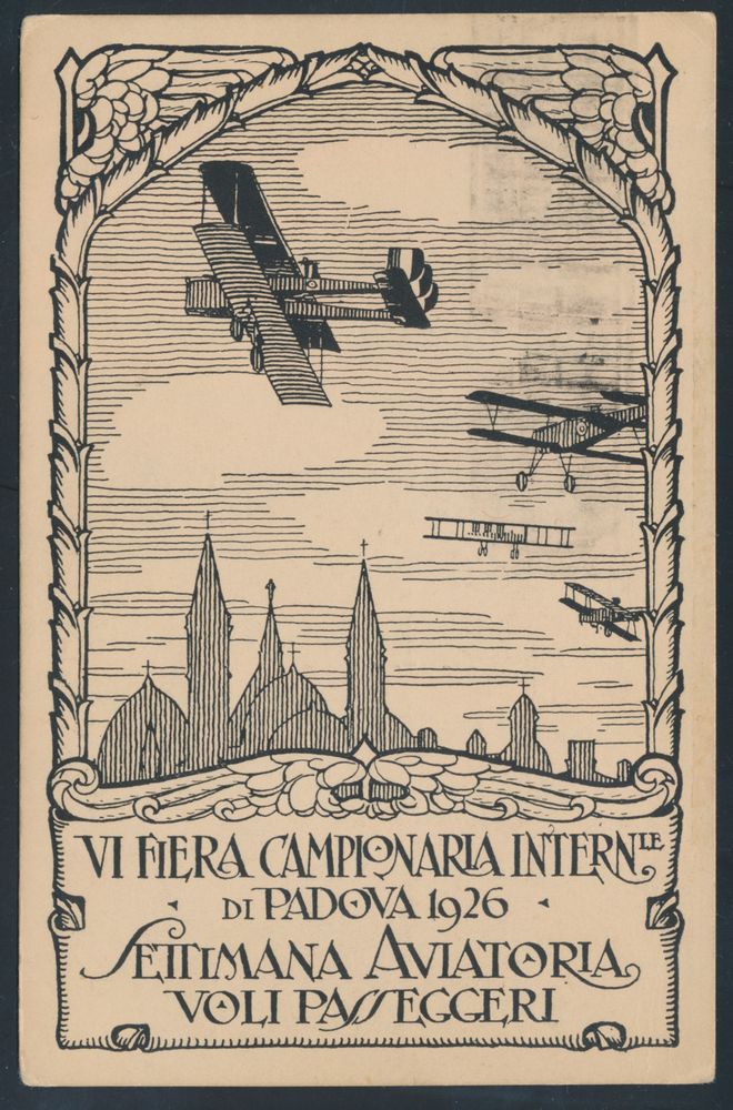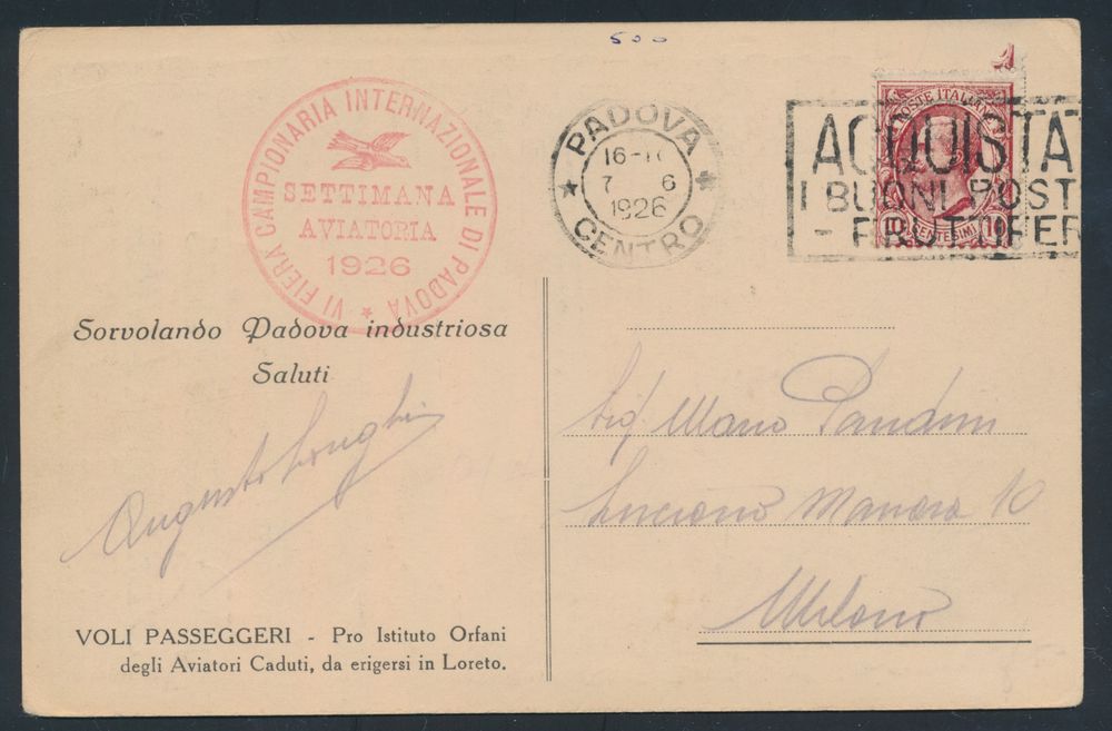 4389 imageItaly: 7.6.1926 N° 64 (Sassone), Padova Settimana Aviatoria official illustrated postcard sent to Milano and franked with a 10c stamp tied by regular slogan postmark, flight cachet alongside in red, vf(Image 1) (Image 2)