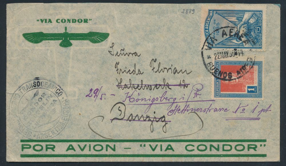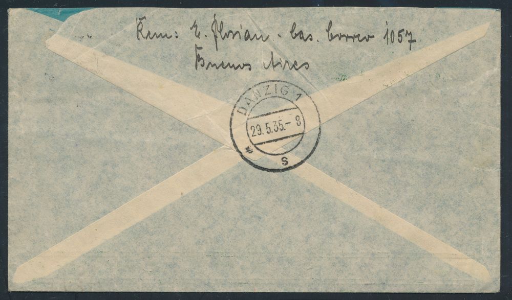 4381 imageArgentina : 22.5.1935 N° 445A (Mi. Zeppelin Specialised), LZ 127 South America Flight cover sent from Buenos Aires to Danzig, Germany, bearing regular Argentinian franking and zeppelin flight cachet on the front, arrival c.d.s. on the back, an uncommon destination, vf(Image 1) (Image 2)