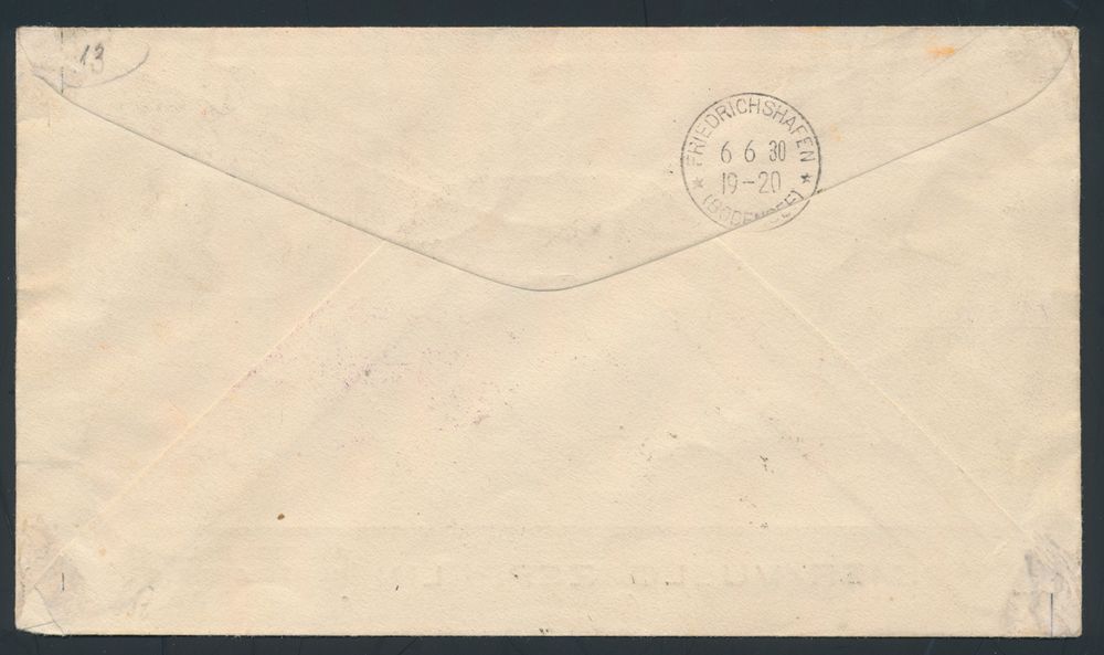4382 imageArgentina : 21.5.1930 N° 68Fa (Mi. Zeppelin Specialised), LZ 127 Argentinian Flight cover addressed to Herne, Germany and franked with Argentinian zeppelin stamps bearing the blue overprint (4 x 50c + 1P), as well as a normal 12c stamp, "First Europe Pan-America Round Flight" special cachet in violet and Freidrichshafen arrival c.d.s. on the back, vf(Image 1) (Image 2)