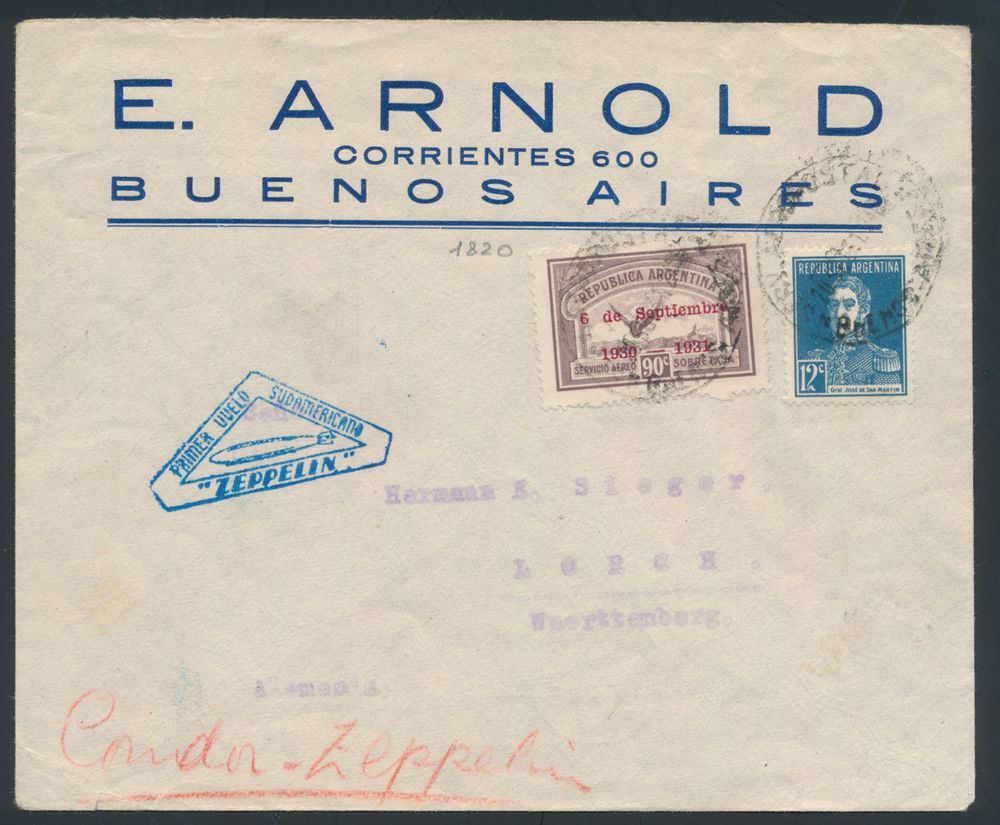 4383 imageArgentina : 20.9.1931 N° 222Ba (Mi. Zeppelin Specialised), LZ 127 South America Flight cover sent from Buenos Aires to Lorch, Germany and bearing airmail + normal stamps, triangular zeppelin flight cachet alongside on the front and Friedrichshafen arrival c.d.s. on the back, vf(Image 1) (Image 2)