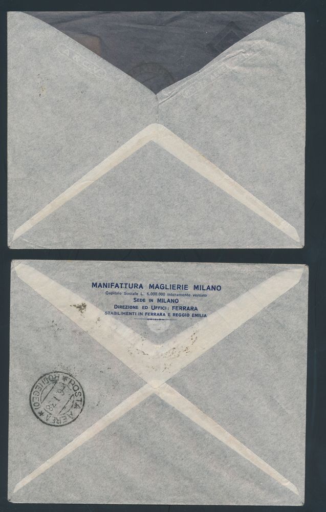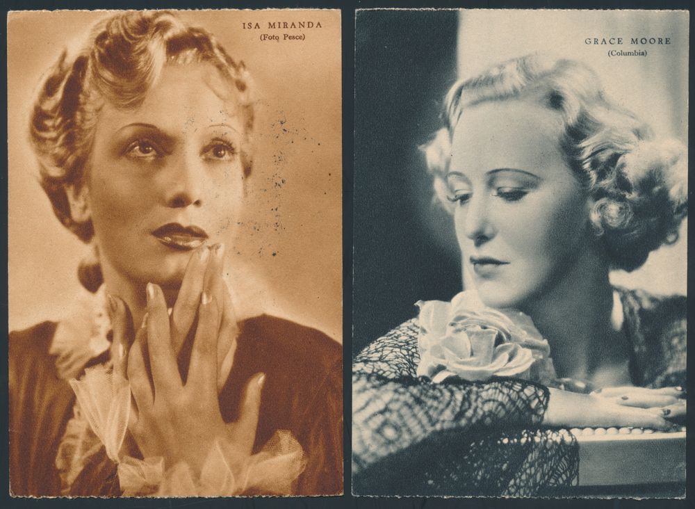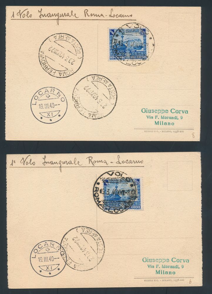 4391 imageItaly: 19.3.1940 N° 525 (Sassone), Roma - Locarno Swissair Flight two picture postcards (depicting Hollywood actresses) both addressed to Milano and franked with the 1.25L value of the Railways Centenary issue of 1939 (Sassone 451), transit and arrival postmarks, vf(Image 1) (Image 2)