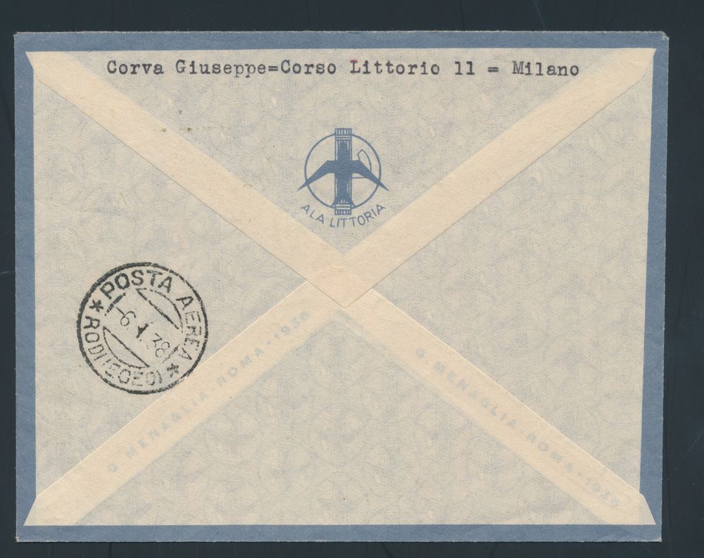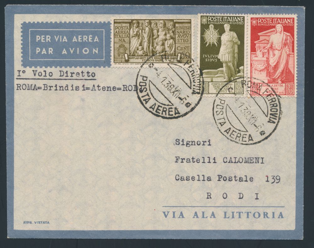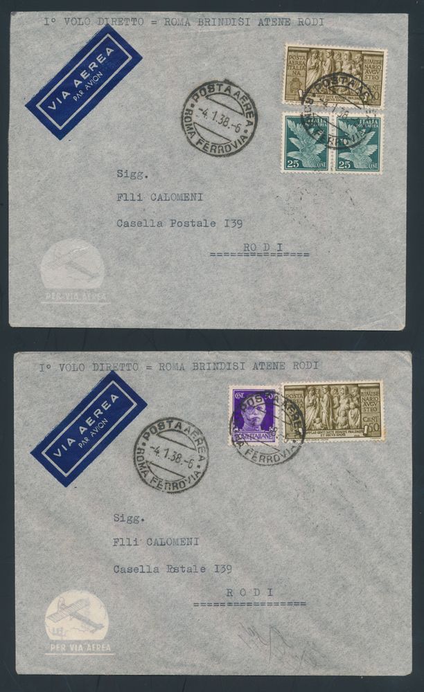 4390 imageItaly: 4.1.1938 Rome-Brindisi-Athens-Rhodes First Direct Flight lot of 3 covers all sent from Rome to Rhodes (one missing the flap on the back), decorative frankings and arrival postmarks on the back (for two of them), vf(Image 1) (Image 2) (Image 3) (Image 4)