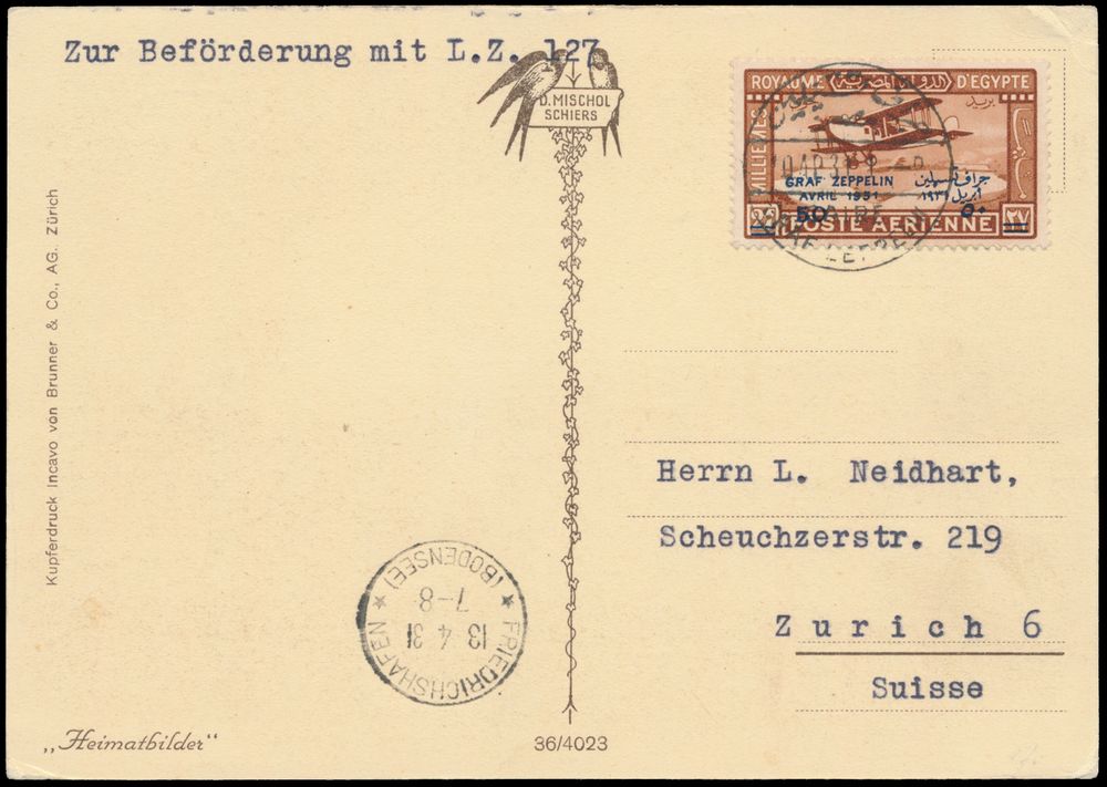 4386 imageEgypt: 10.4.1931 N° 166 A a I (Mi. Zeppelin Specialised), LZ 127 Egypt Flight picture postcard sent from Cairo to Zürich, Switzerland and franked with the Egyptian 50 on 27m stamp (Michel 156), Friedrichshafen landing postmark, vf(Image 1) (Image 2)