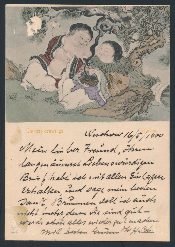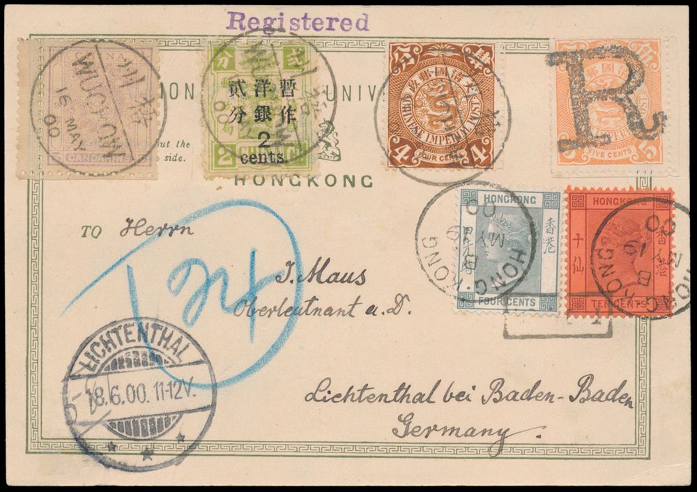 4478 bl image1900 Illustrated card, registered from Wuchow via Hong Kong to Lichtenthal (Germany) tied with Yv. 5 (small dragon "3c. lilac" with left and part lower margin, making this piece very rare), 18, 49 and 50a, the Hong Kong stamps are Yv. n° 14 and 35, a gem for each collection, vf - see photo cover(Image 1) (Image 2)
