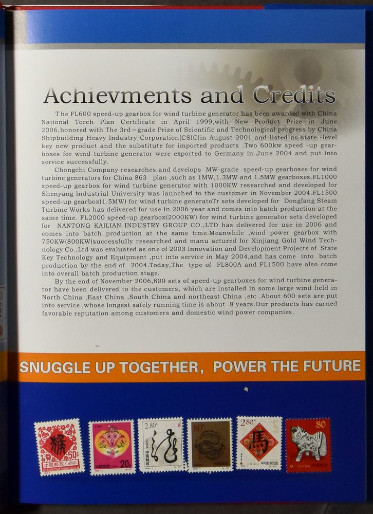 4470 nh imageRepresentative gift book with stamps included, Chongqing Chongchi wind power gearbox, with Chinese stamps from 2006, beautifully presented on sheets, language: English and Chinese, vf(Image 1) (Image 2) (Image 3) (Image 4)