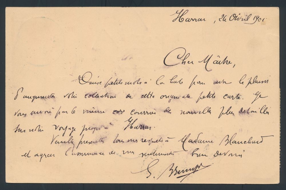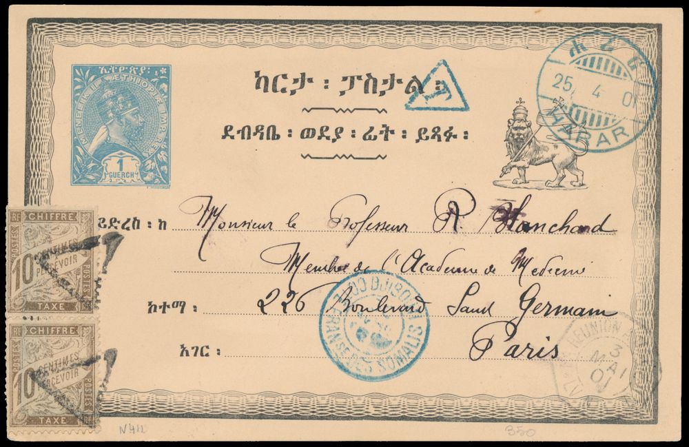 4551 PWST imageEthiopia, 1901, postcard "1 Guerch" sent from Harar to Paris via Djibouti and Réunion, with penalty postage "20c. (pair "10c.") and triangular stamps, rare and attractive item, vf(Image 1) (Image 2)