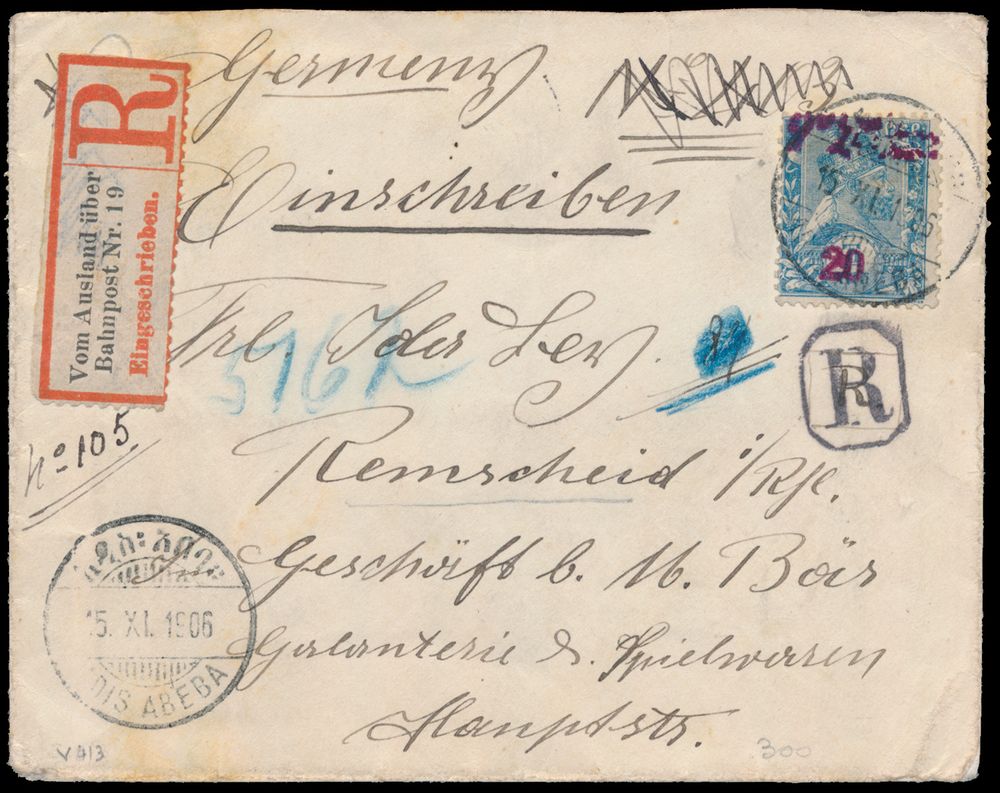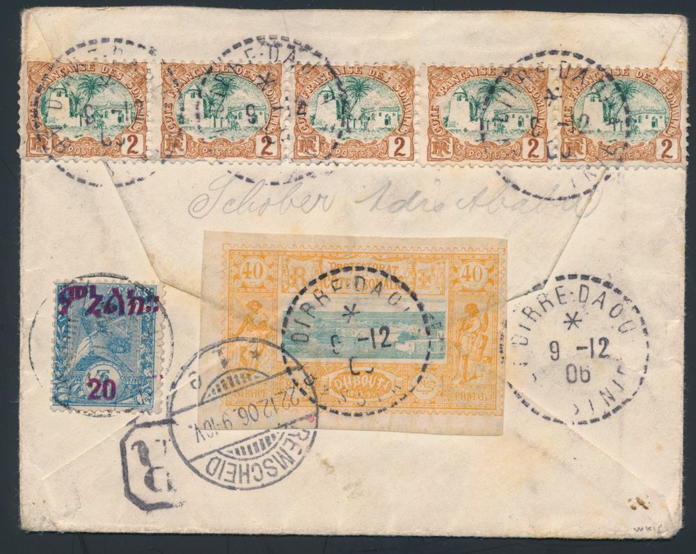4552 imageEthiopia, 1906, registered letter from Addis Ababa to Romscheid, franked with Yv. n° 65 (20 on 1g.), 1x front and 1x back, back also richly franked with "Côtes des Somalis" stamps, including "40c.", very nice letter, vf(Image 1) (Image 2)