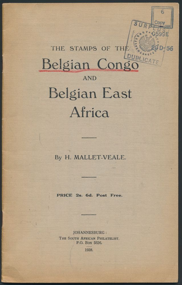 Mallet-Veale; The South African Philatelist, Johannesburg (SA); 1928; Printed; stapled; English; 39 pag.; soft cover; very fine; an early English-language work on the issues of Belgian Congo and Belgian East Africa, unusual(Image 1)