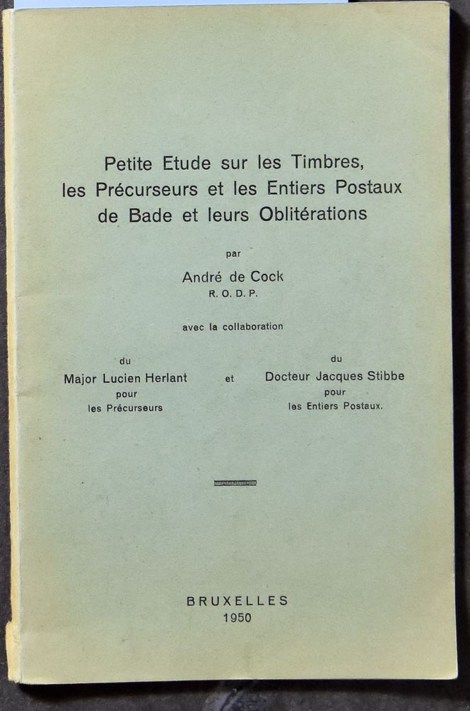 Postaux de Bade et leurs Oblitérations; André de Cock, Lucient Herlant & Jacques Stibbe; 1950; Printed; bound; French; 80 pag.; soft cover; in reasonable condition(Image 1)