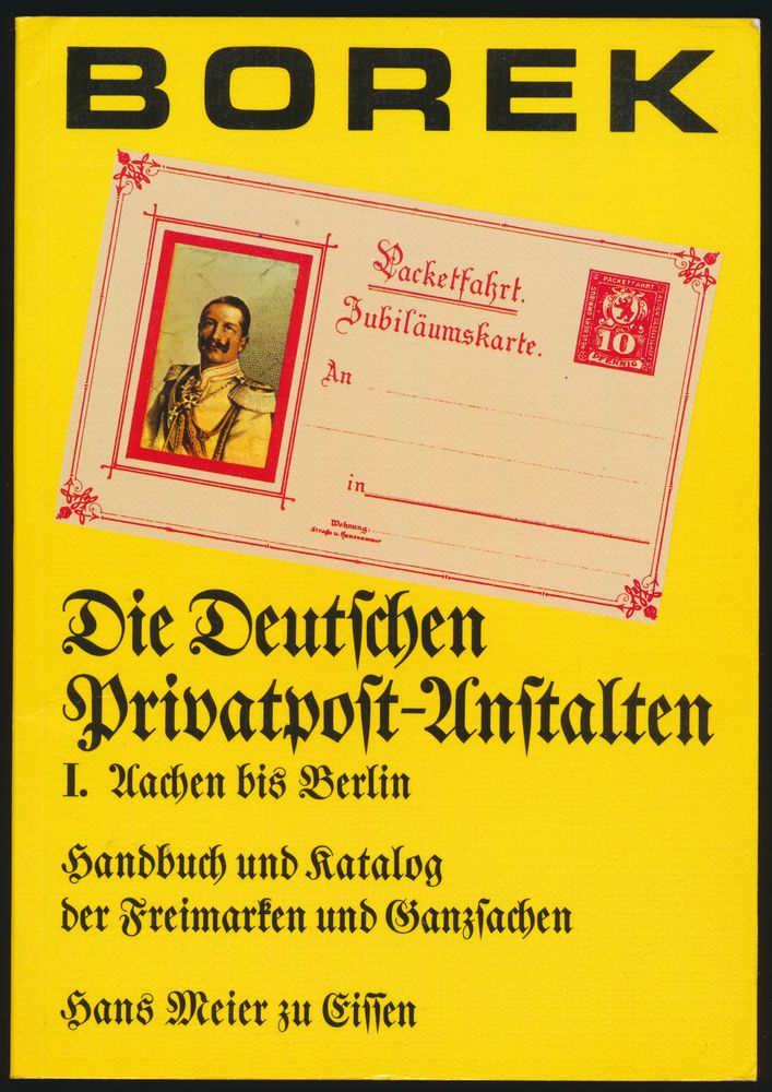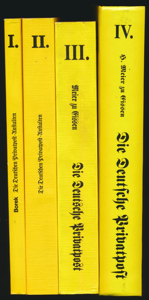 Borek GmbH (Vol. I), Verlag Meier zu Eissen (Vols. II - IV), Germany; 1979 - 1997; Printed; stapled; German; 304 + 480 + 494 + 537 pag.; soft cover; very fine; The complete and definitive reference work on German private city post courier stamps and