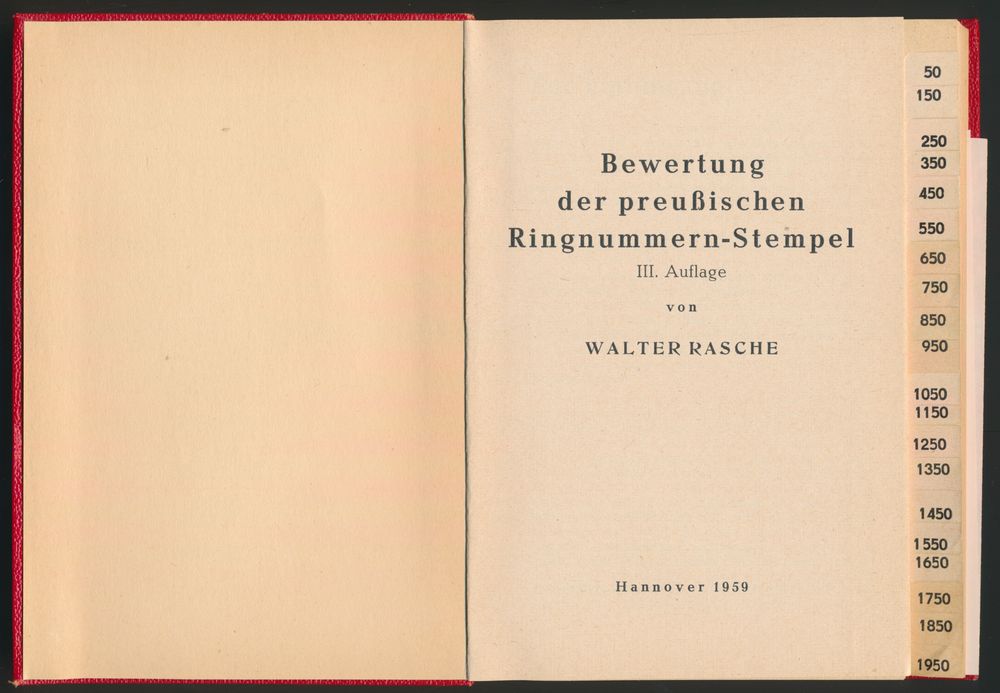 Walter Rasche; published by the author himself; 1959; Printed; stapled; German; 119 pag.; soft cover; very fine; Pocket-sized catalogue of dot stamps on Prussian stamps(Image 1)