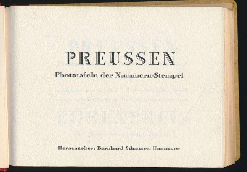 Schirmer; published by the author himself; 1952; Printed; bound; German; approx. 120 pag.; hardcover; very fine; High-quality colour photographs of the highlights from the author's specialised collection of Prussian postmarks, exhibited and awarded
