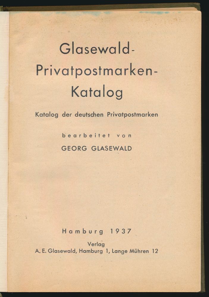 A.E.Glasewald, Hamburg; 1937; Printed; bound; German; 160 pag.; hardcover; very fine; first edition of the well-known catalogue of German private city postage stamps from courier companies, scarce(Image 1)