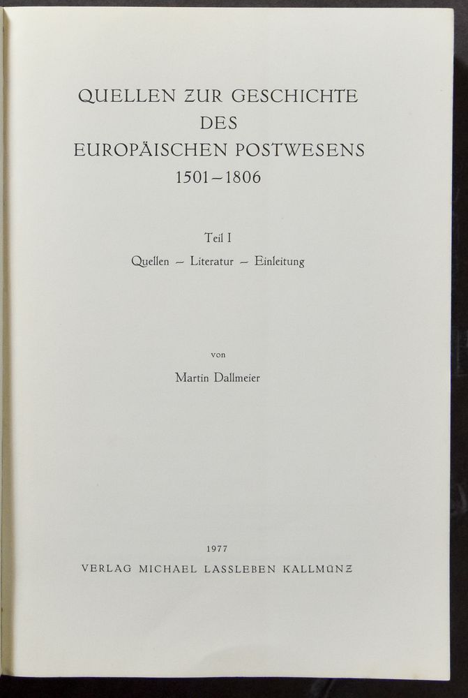 Europäischen Postwesens 1501-1806, Teil 1 + 2; Martin Dallmeier; Verlag Lassleben Kallmünz; 1977; Printed; bound/glued; German; soft cover; in reasonable condition(Image 1)