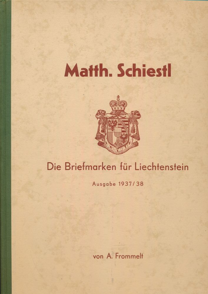 Liechtenstein Ausgabe 1937/38"; A. Frommelt; Buchdruckerei Kaiser, Vaduz; 1939; Printed; bound; German; 72 pag.; hardcover; very fine; book in album form dedicated to the Liechtenstein issue of 1937-38 and to the engraver Matthäus Schiestl, original