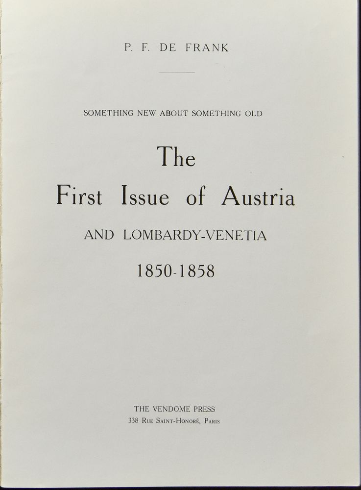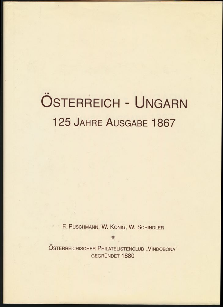 Puschmann, W. König, W. Schindler;" Austrian Philatelists' Club "Vindobona", Vienna"; 1992; Printed; bound; German; 230 pag.; hardcover; very fine; monograph on the Austrian issue of 1867, extensively illustrated, complete with dust jacket, numbered