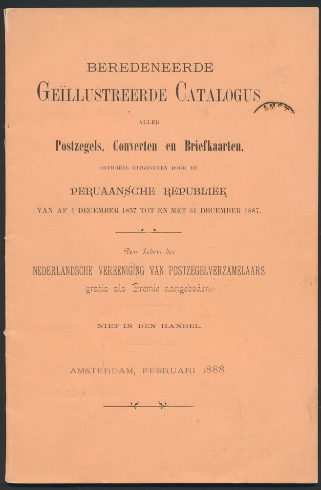 Postzegels, Couverten en Briefkaarten, officieel uitgegeven door de Peruaansche Republiek van af 1 December 1857 tot en met 31 December 1887"; Dutch Association of Stamp Collectors (collective); Dutch Association of Stamp Collectors, Amsterdam; 1888;