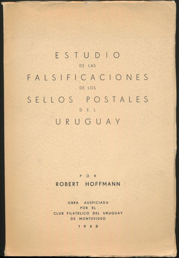 postales del Uruguay; Robert Hoffmann; Club Filatelico del Uruguay, Montevideo; 1948; Printed; stapled; Spanish; 115 pag.; soft cover; very fine; the well-known study on counterfeits of classic Uruguayan stamps, still used as a reference today,