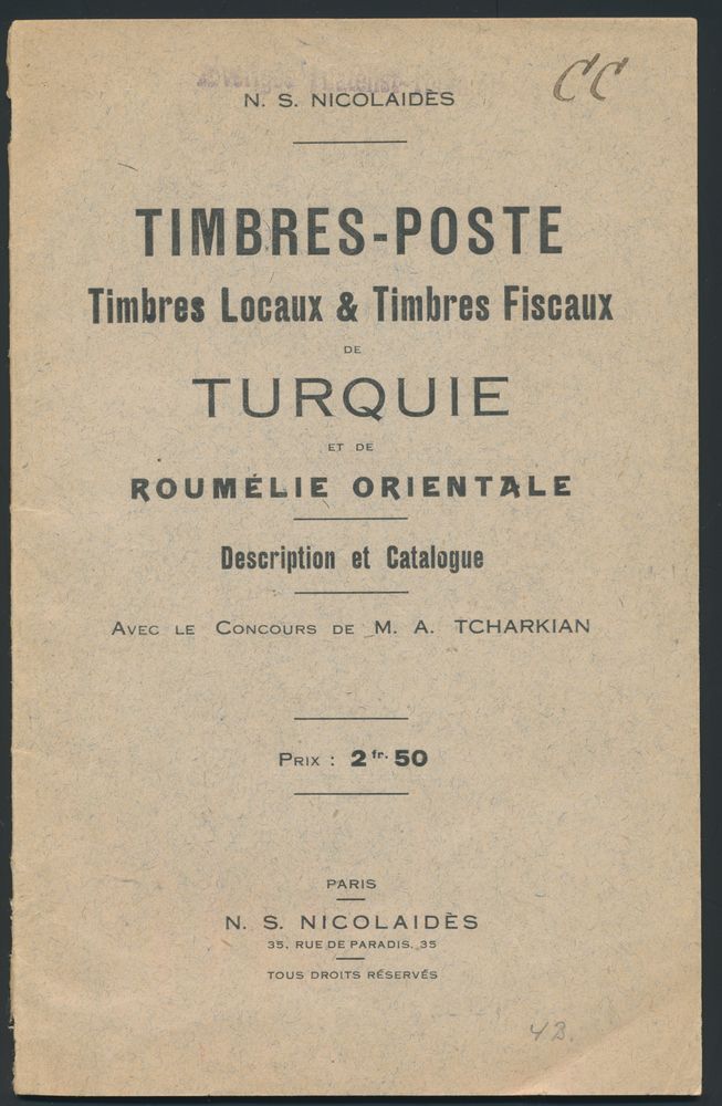 Turquie et de Roumélie Orientale - Description et Catalogue"; N. S. Nicolaidès; published by the author himself; 1912; Printed; stapled; French; 44 pag.; soft cover; in good condition; The first catalogue ever to include both Turkish (Ottoman) local