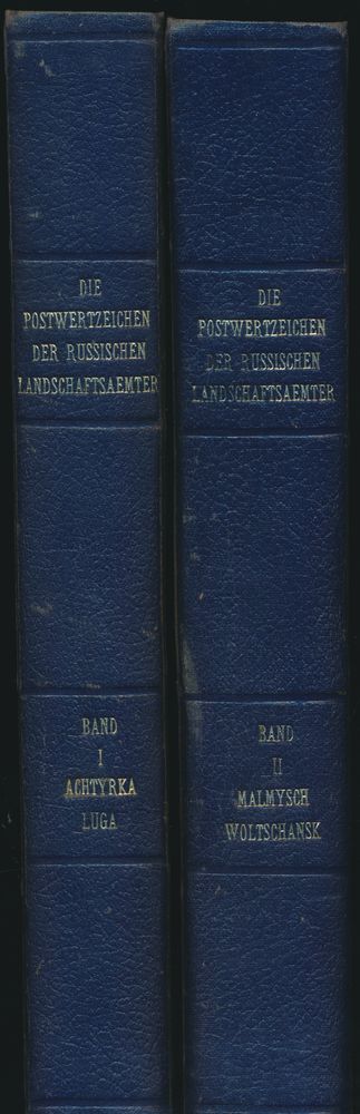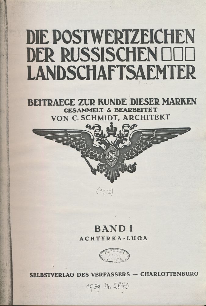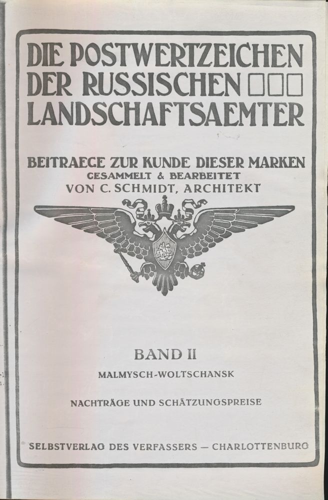 C. Schmidt; published by the author himself; 1939; Photocopy; bound; German; 300 + 407 pag.; hardcover; very fine; One of the most famous catalogues of Russian Zemstvo stamps (here as a photocopy from the 1960s (approx.), beautifully bound in two