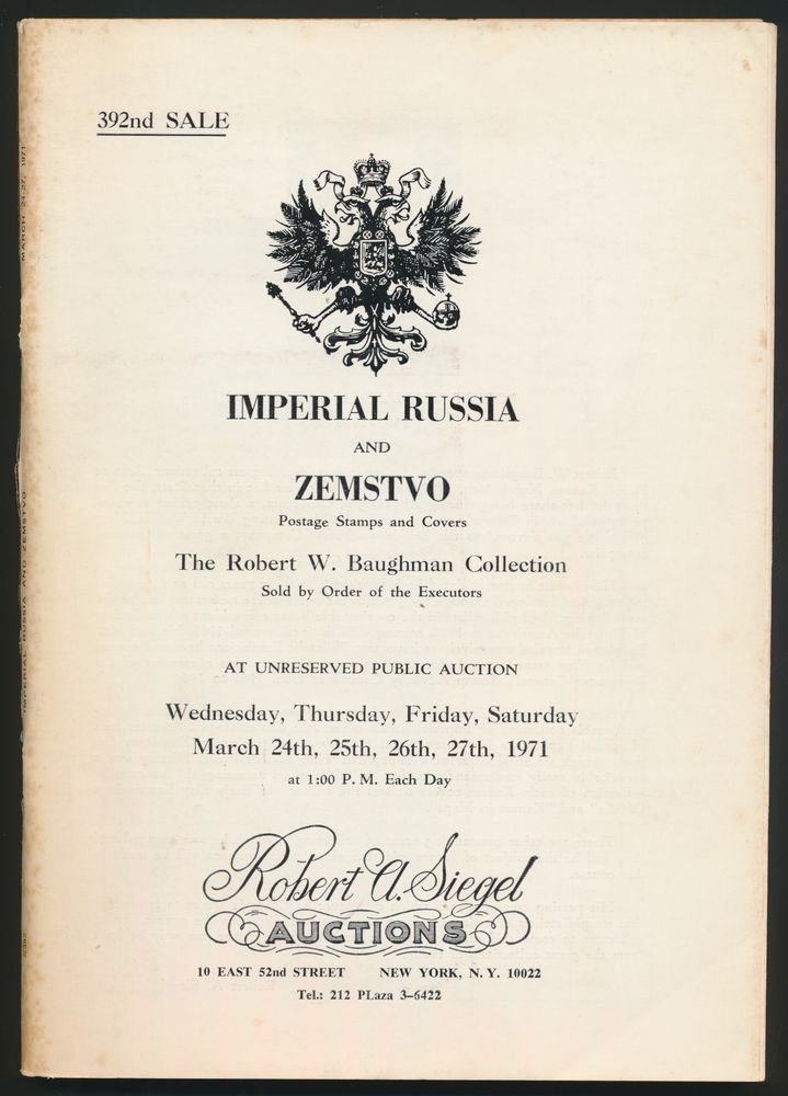 Covers; Robert W. Baughman; Robert A. Siegel Auctions, New York; 1971; Printed; stapled; English; 159 pag.; soft cover; very fine; Auction catalogue of a very important collection of Zemstvo stamps and postal history, an important and much