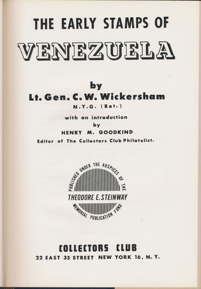 Wickersham; The Collectors Club, New York; 1958; Printed; bound; English; 156 pag.; hardcover; in good condition; One of the relatively few books written on Venezuelan philately with the aim of providing a comprehensive overview of the classic