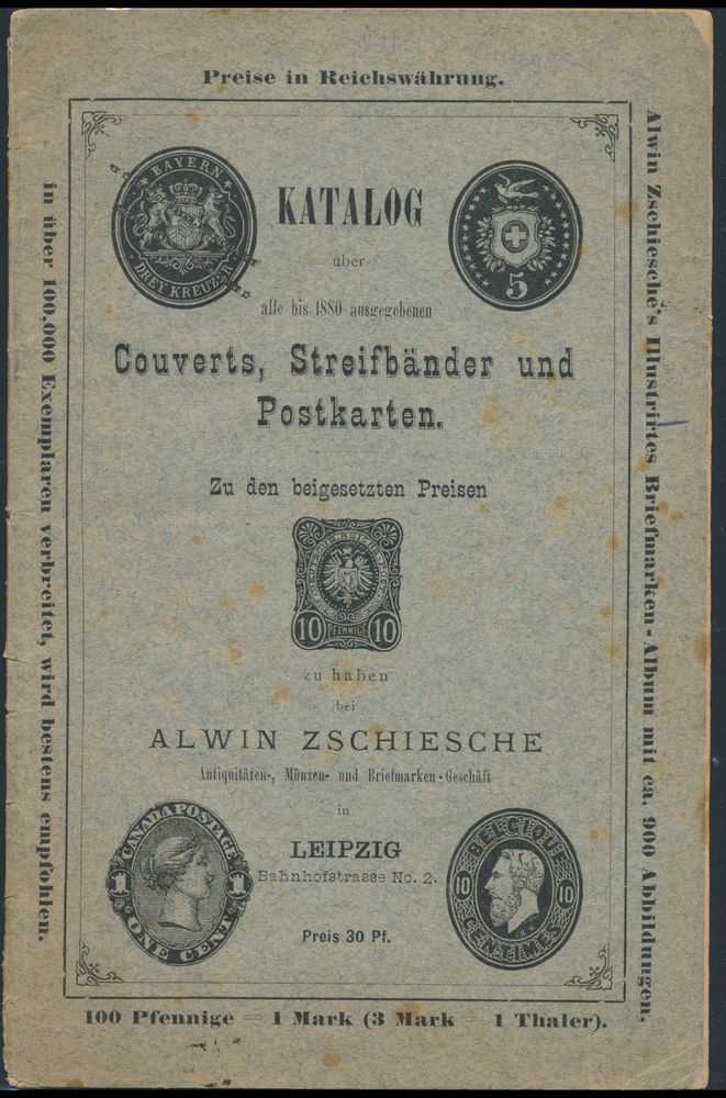Streifbänder und Postkarten; Alwin Zschiesche; published by the author himself; 1880; Printed; stapled; German; 21 pag.; soft cover; very fine; Undoubtedly one of the earliest postage stamp catalogues in the world, published by one of the few