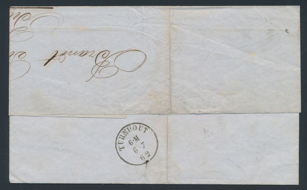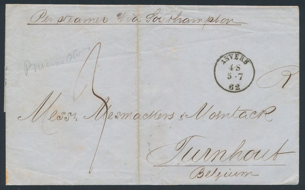934 image1862 Forerunner, with manuscript "Per steamer via Southampton", no content, but mention of "Brandt Söhn and C. Buenos Ayres", departure stamp "Anvers", dated 5-7 62, to Turnhout, with charge of 3 decimals, f(Image 1) (Image 2)