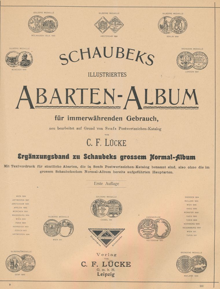 926 LIT imageSchaubecks Illustriertes Abarten-Album; Schaubeck; C.F. Lücke G.m.b.H., Leipzig; ca. 1920; Printed; bound; German; approx. 700 pag.; hardcover; as new;" The first edition of a specialised Schaubeck World Album entirely devoted to VARIETIES, completely new and untouched by any stamp or hinge, without pencil marks or other annotations, making it without doubt one of the greatest rarities in the "albums" section of philatelic literature, and even a great rarity in philatelic literature in general. It is highly unlikely that more than a few (if any) Schaubeck albums from the standard editions have been preserved complete and absolutely untouched by any stamps or hinges. However, this album, entirely devoted to varieties, is in itself a great rarity, in whatever condition (the cataloguer has not seen a single other copy in any condition in more than 20 years of a very active philatelic career). The fact that it is completely untouched and never used makes it even more exceptional."(Image 1) (Image 2) (Image 3) (Image 4) (Image 5)