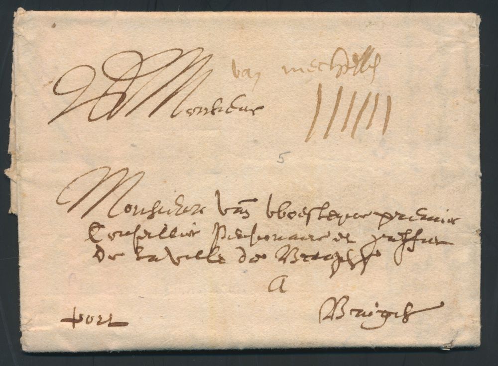 939 image1668 Forerunner with contents, dated 13 March 1668, to Bruges, charge indication "IIIIII", vf(Image 1)