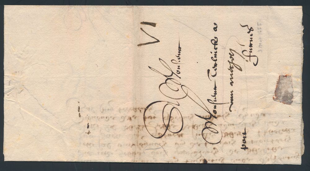 938 image1655 Forerunner with contents, from Mechelen, dated 3 August 1655, to Furnes (Veurne), charge VI in black, manuscript 'charge' bottom left, vf(Image 1)