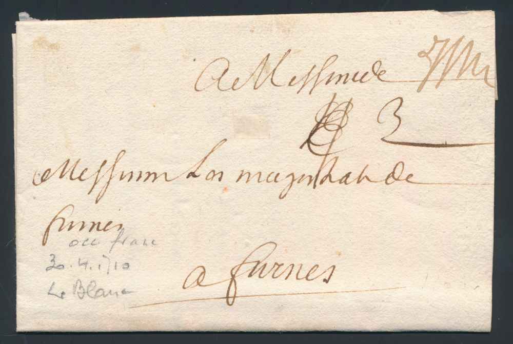 945 image1710 Forerunner with contents from Ypres, dated 30 April 1710, to Furnes (Veurne), charge 3 decimen, vf(Image 1) (Image 2)
